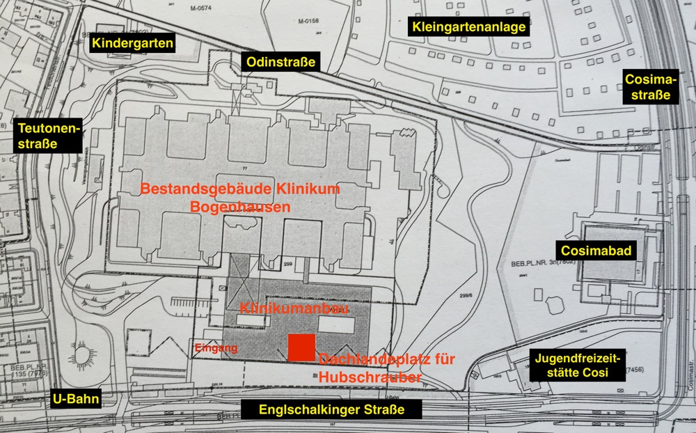 Lageplan des Klinikums Bogenhausen mit dem geplanten Erweiterungsbau samt Hubschrauberlandeplatz auf dem Dach. Karte: Planungsreferat/hgb