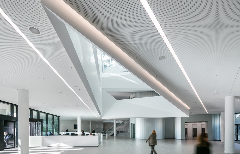 Die Fassade mit den „Kastenfenstern“ sieht von außen – wegen des Denkmalschutzes – aus wie früher. Die Aluminiumprofile – etwa 85 Prozent der alten Bleche wurden wiederverwendet – zwischen den Panellen wurden perforiert, erhielten rund zwei Millionen klitzekleine, kaum sichtbare Löcher zwecks Belüftung der Zwischenräume. Diese wurden geschaffen durch eine zweite, innen installierte Schale kombiniert mit einem computergesteuerten Sonnenschutzsystem, was eine wärmetechnische Optimierung bewirkt. Ausreichend Sauerstoff an den neuen Arbeitsplätzen – die Innenfenster können elektrisch individuell wie auch zentral gesteuert gekippt werden – ist also garantiert. Das war einst nicht so: In den Räumen erwärmte sich die Luft unter anderem durch die Gebläse der Computer oft sehr stark, die Lüftungsanlage war vielfach überfordert.