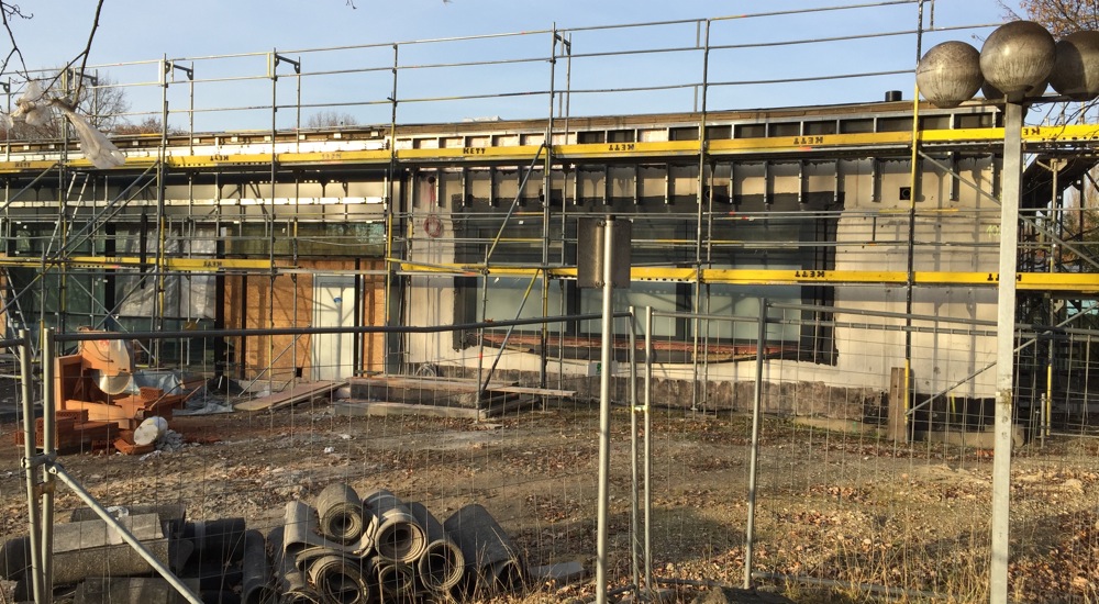Die feuchte Luft in der Schwimmhalle hatte den vielen Verbindungsteilen extrem stark zugesetzt. Die hölzerne Dachkonstruktion musste abgetragen und durch einen Stahlaufbau ersetzt werden. Auch an den Fassaden mussten die Holzverkleidungen entfernt und dafür Stahlrahmen für eine Glasfassade installiert werden.