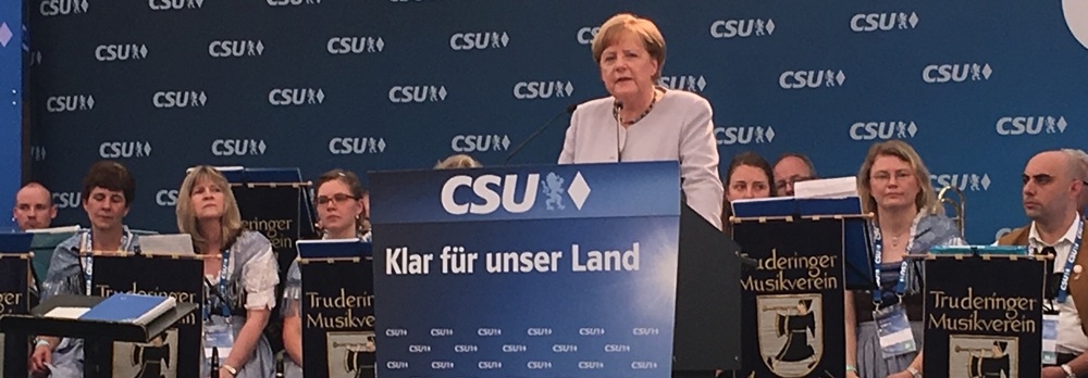 In Begleitung von Seehofer schüttelte sie – hellbeige Hose, hellgrauer Blazer – schon vor dem Zelt links und rechts Hände, lächelte, ja strahlte übers ganze Gesicht, nahm sich Zeit für erbetene Selfies mit ihr, schaute auf Zuruf hin, ließ sich die beste Stimmung von einigen Demonstranten, die „Hau ab“ brüllten, nicht vermiesen. Unter Standing Ovations bahnten dem Duo Dutzende verzweifelt, ja gestresst wirkende Sicherheitsleute einen schmalen Weg durchs Zelt, in dem das Thermometer inzwischen gen 35 Grad tendierte. Entsprechend der Temperatur „kochte“ der Saal – die Stimmung musste fürwahr niemand mehr anheizen.