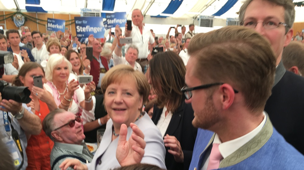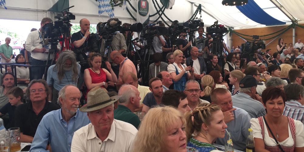 Dann war „sie“ dran, endlich. Energiegeladen trotz aufreibender Termine auf Sizilien in den Tagen davor. Kämpferisch, klar, direkt, deutlich, bestimmt, mal mit einem Arm, mal mit beiden Armen Argumente unterstreichend, ab und zu auch mit geballter Faust, 36 Minuten stets mit fester Stimme frei redend zog Angela Merkel die Menschen in ihren Bann. Faszinierend. Den kräftigen Schluck Bier aus ihrem Maßkrug am Ende hatte sie sich wahrlich verdient. Unbeeindruckt war sie zuvor von zwei jungen Männern in Trachtenkleidung, die sich in der Reihe vor den Fernsehteams postiert und rechte Parolen postuliert hatten. Nach ein paar Sekunden hatte die Security die Situation und die beiden Störer ihm Griff.