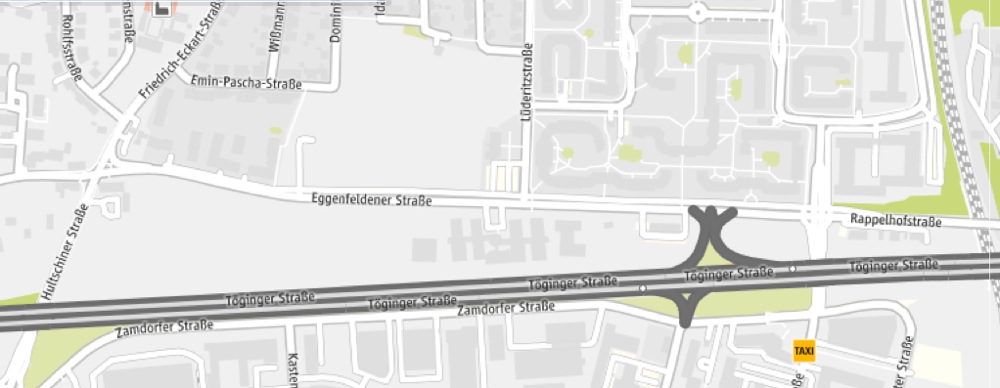 Zum Autoverkehr wird den Referatsunterlagen angeführt: „Das Planungsgebiet ist sehr gut in das überregionale Straßennetz eingebunden durch die Autobahnausfahrten Zamdorf (rund 350 Meter entfernt) und Steinhausen (rund 750 Meter entfernt).“