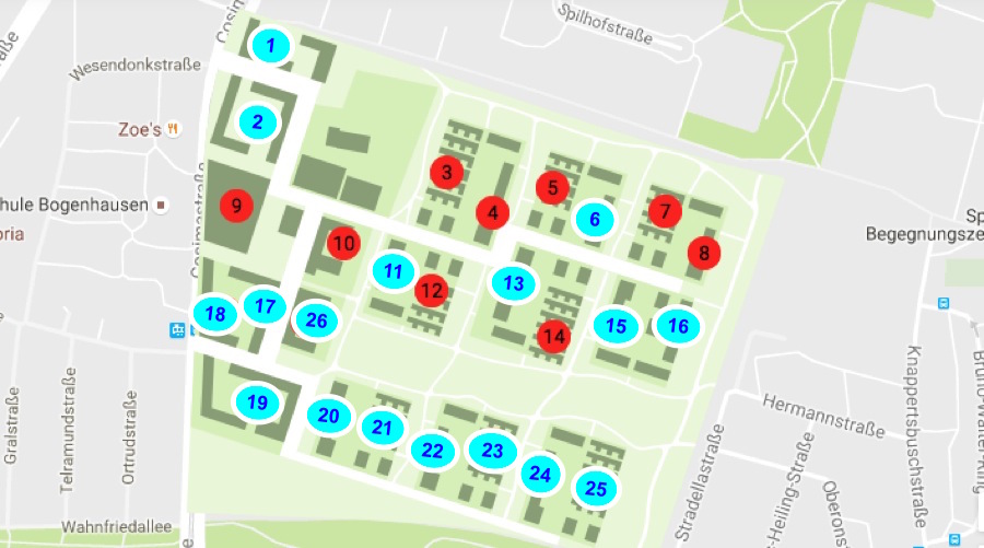 - Die meisten Baufelder haben eine Art Teppichbebauung mit kleinen Gassen, die die Häuser erschließen. Jeder Gasse endet an der Mauer, die das Baufeld vom Park abgrenzt anstatt der Blick in die Parklandschaft freizugeben. Eine insgesamt dunkle, schattige und bedrückende Situation.