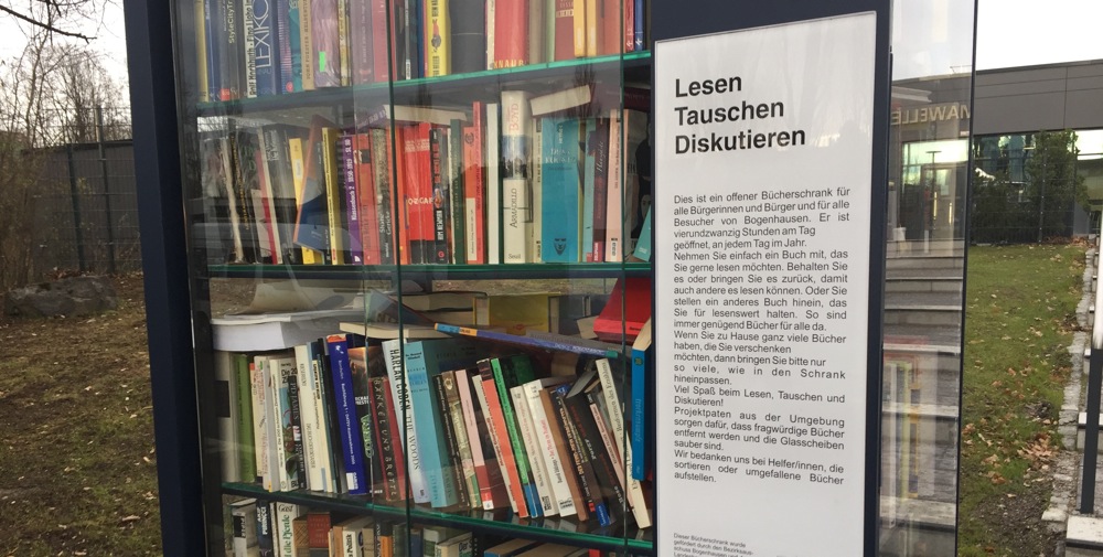 „Lesen – Tauschen – Diskutieren“ – unter diesen Schlagwörtern heißt es auf dem Schild: „Das ist ein offener Bücherschrank. Er ist vierundzwanzig Stunden am Tag geöffnet, an jedem Tag im Jahr. Nehmen Sie einfach ein Buch mit, das Sie gerne lesen möchten. Behalten Sie es oder bringen Sie es zurück, damit auch andere es lesen können. Oder Sie stellen ein anderes Buch hinein, das Sie für lesenswert halten. So sind immer genügend Bücher für alle vorhanden. Bringen Sie bitte nur so viele Bücher, wie in den Schrank hineinpassen.“ Lästige Anmeldeformulare und die Beachtung einer zeitlichen Frist entfallen also.