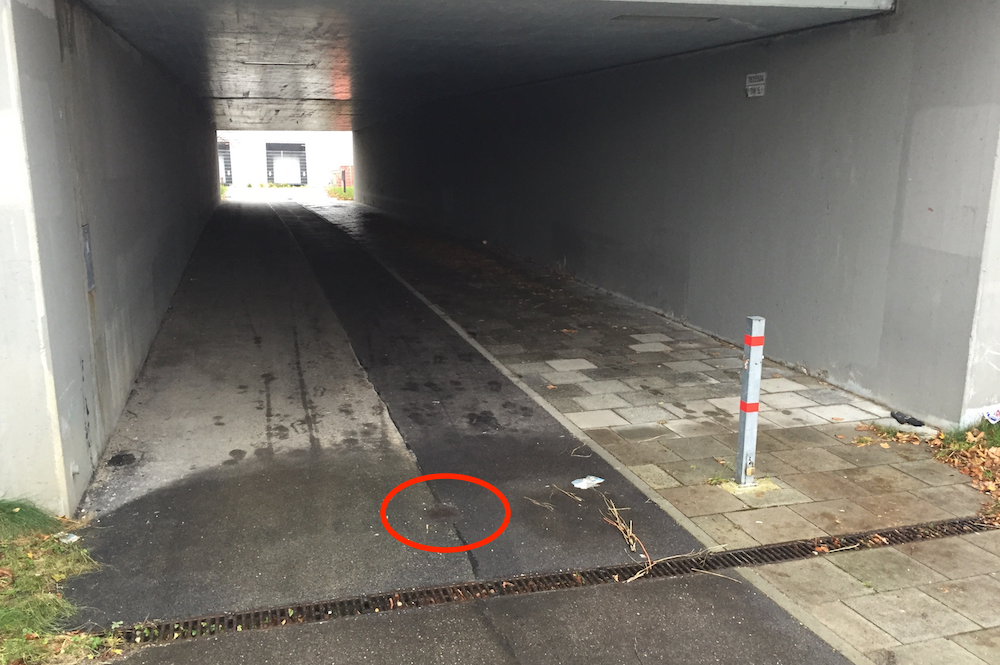 Laut Anwohnern waren einst am Unterführungszugang zwei Poller installiert, die eine Durchfahrt von Fahrzeugen verhinderten. Doch beide Pfosten waren offensichtlich gewaltsam entfernt worden. Nach Teerung des Tunnelwegs wurde lediglich ein Poller durch die städtischen Arbeiter am Rand des Fußgängerwegs wieder eingesetzt. Die breite Radweg-Durchfahrt blieb unversperrt – eine Lücke für diverse Autofahrer, die sich so einen kilometerlangen Umweg ins Gewerbegebiet ersparten.