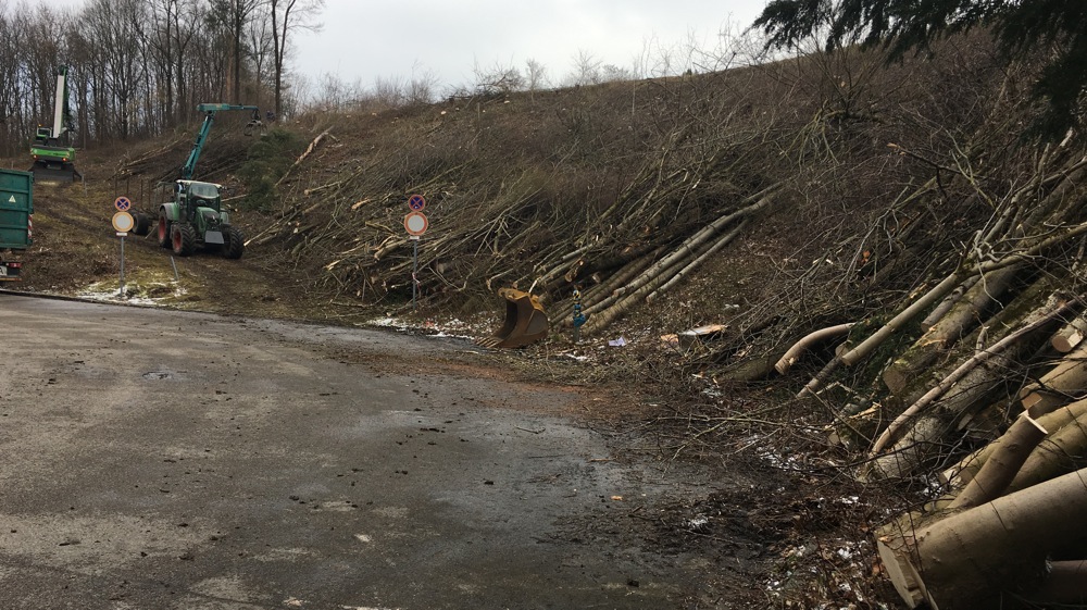100 Bäume? 85 Bäume – erstaunlich: Sieht man sich vor Ort am Hang entlang des Hubschrauberlandeplatzes östlich des Krankenhauses um, wo im Anschluss der Anbau errichtet wird, müssen wohl weit mehr als 200 stämmige Bäume abgeholzt werden – wohlgemerkt Bäume, keine dürren Bäumchen, keine Sträucher und kein Gestrüpp. Fotos belegen das!
