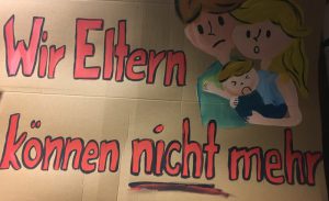 Mütter protestierten mit Plakaten wegen der noch nicht gesicherten Kinder- und Schulbetreuungs-Lage im Prinz-Eugen-Park Foto: hgb