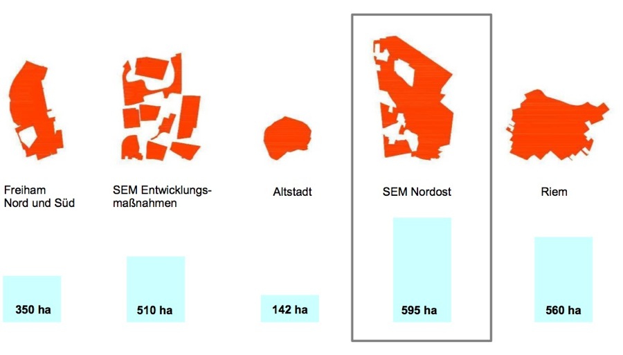 Aprospos Zeit: Der Einleitungsbeschluss SEM Nordost datiert vom 5. Oktober 2011, der Einleitungsbeschluss SEM Trabrennbahn Daglfing (Untersuchungsgebiet circa 34 Hektar) vom 23. Juli 2008.