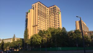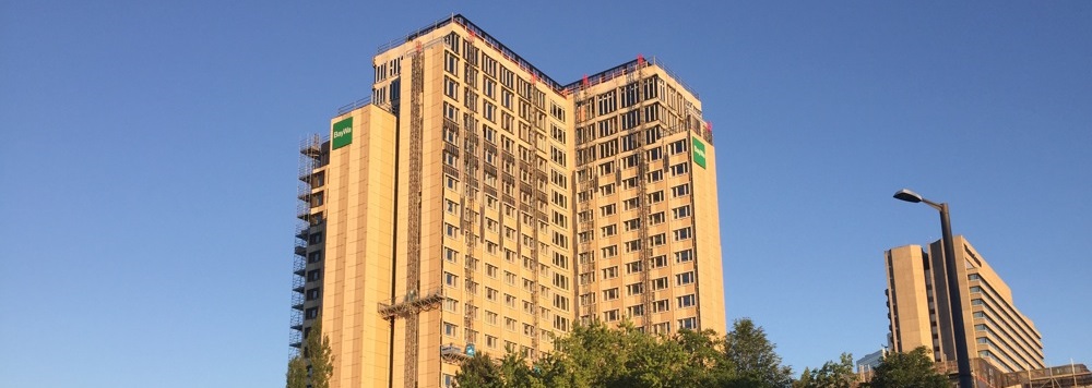 Warum die Einschränkungen? Der Wolkenkratzer mutet jetzt zwar ansprechender an als mit der einstigen Sichtbeton-Fassade. Doch das neue Gesicht ist Geschmackssache. Die einen (wenige) sind angetan bis begeistert, andere (viele) sind enttäuscht, erinnern teils an das Aussehen von Wohn- und Bürosilos in New York in den Sechziger Jahren. Die abgestuft von mattgold, mattmessing, kakaobraun bis hin zu beige gehaltenen rechteckigen Wandplatten, die in der Abendsonne teils schimmern, entsprechen nicht jedermanns Ästhetik.