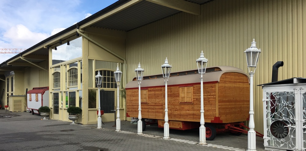 Das Vorfeld der großen Halle, Theaterfabrik und Spiegelsalons befinden sich nebeneinander, ist hingegen neu gepflastert, restaurierte Bauwagen links und rechts vom teils mit Spiegeln eingefassten Eingang sowie sechs historische, weiß lackierte Straßenlampen vermitteln einen nostalgischen Eindruck, der sich im Innern der Halle bestätigt. Das ist also die Eventlocation der „La Ma Wo GbR Nöth, Nöth, Schwenold“. Wobei „La“ und „Ma“ die Anfangsbuchstaben von Nöths Töchtern Laila und Magelina sind sowie „Wo“ für Wolfgang (Nöth) selbst steht.