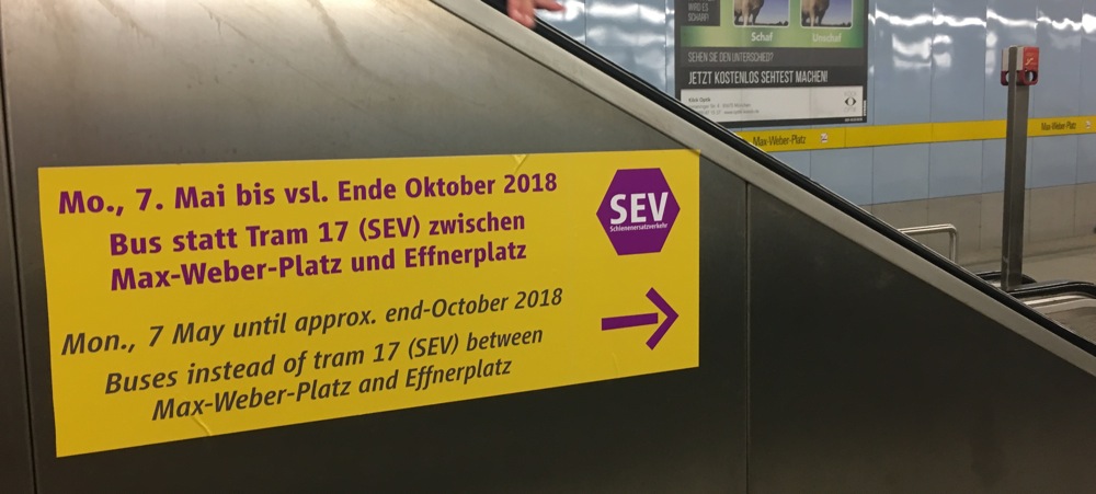 In den ersten zwölf Wochen bis zum Beginn der Sommerferien kommt es in der ersten Phase – insgesamt sind es vier – zu gravierenden Änderungen, also Bus statt Tram in der Ismaninger Straße. Anstelle der Tramlinie 17 fährt in der Ismaninger Straße ein Bus zwischen Max-Weber-Platz und Effnerplatz. In nördlicher Fahrtrichtung wird die Linie bis zur Sternwartstraße durch die Ein­bahnstraße in der Ismaninger Straße geführt. Nach Süden fährt der Schienenersatzverkehr (SEV) eine Umleitung über die Scheiner-, Possart- und Grillparzerstraße.