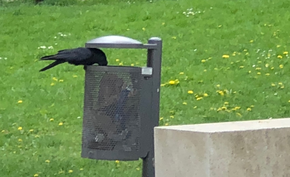 Doch sobald das Wetter richtig schön ist, die Sonne scheint und mehr Menschen ihre Zeit im Freien verbringen, desto mehr Müll fällt logischerweise an. Sind die runden Tonnen dann etwa drei Viertel voll, haben die Krähen erneut leichtes Spiel. Gewitzt und geduldig warteten sie, bis der Abfall sichtbar ist und sie ihn herausfischen können.