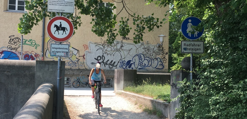 Das Schild „Radfahrer absteigen“ und das Verkehrszeichen 239, eine Frau mit Kind auf blauem Untergrund, also eine Strecke nur für Fußgänger, ist an allen Zuwegen und -fahrten übers Isarwehr in Oberföhring angebracht. Doch kaum ein Radler hält sich an die Vorschrift. Manch eine(r) kurvt rasend schnell mit dem Moutainbike um Senioren, Mütter mit Kindern und Hunde herum, die oftmals erschrocken zur Seite oder zurück weichen.