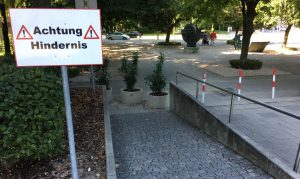 Tatsächlich, so längere Beobachtungen von unser-bogenhausen.de vor Ort, ist der Durchgang beziehungsweise die Durchfahrt möglich – wohlgemerkt möglich, wenn auch vielfach extrem schwierig. Eine junge Frau mit einem Zwillingskinderwagen rumpelte bei der Abfahrt zunächst gegen den letzten Betonblumentrog und dann streifte sie den seitlichen Sockelrand. Ein offen­sichtlich geübter Klappradl-Fahrer, der die Engstelle wohl kennt, ignorierte den Schildhinweis „Radfahrer bitte absteigen“, tippelte mit den Fußspitzern auf dem Boden und kurvte durch. Und eine Seniorin mit Rollator steuerte „elegant“ und geübt an den Hindernissen vorbei, tat sich ihren Rollator aufwärts schiebend an den Rampe allerdings sehr schwer.