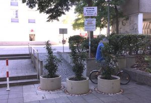 Drei vor mehr als drei Monaten installierte Pflanztröge an der Fideliostraße 15, an einer Rampe, die den barrierefreien Zugang zum angrenzenden Innenhof und weiter zu einem Einkaufszentrum ermöglicht, müssen „sofort“ wieder entfernt werden“. Das hatten Anfang Mai die Mitglieder des Bezirksausschusses auf Initiative von Gremiumschefin Angelika Pilz-Strasser gefordert. Die Lokal­politiker hatten die Stadt gebeten, auf die Eigentümer einzuwirken. Nun liegt die Antwort dazu vom Kreisverwaltungsreferat (KVR) vor.