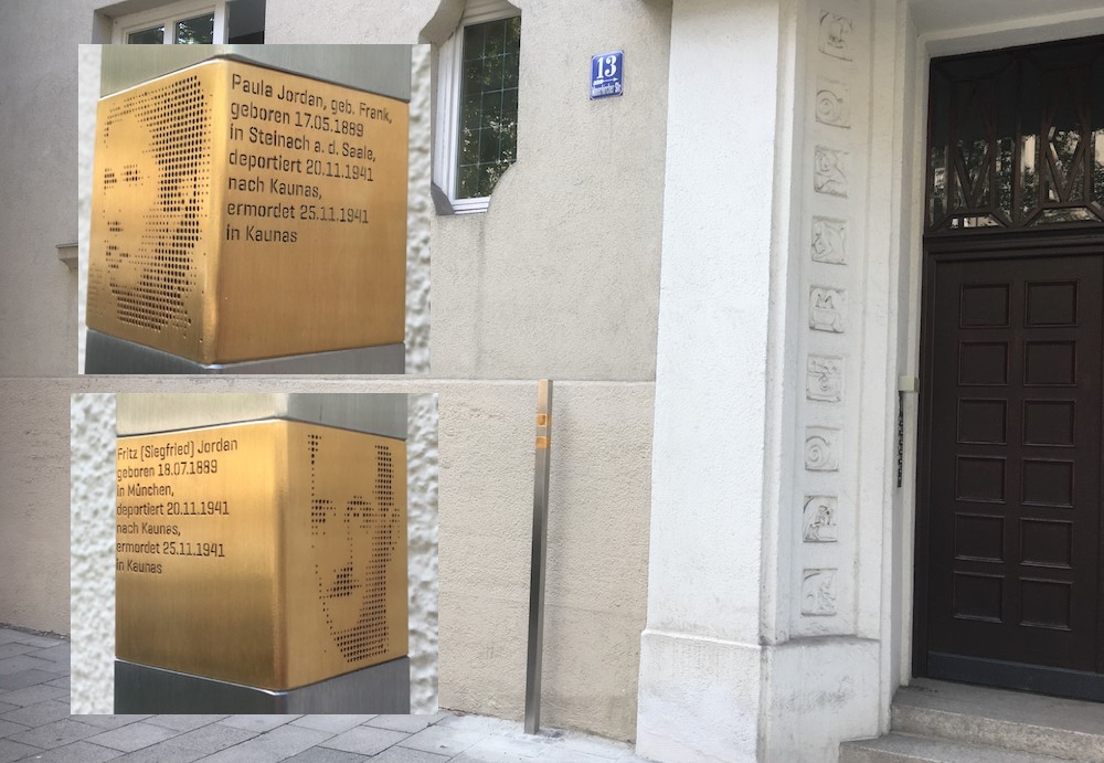 Das jüdische Paar – sie aus Unterfranken, er gebürtiger Münchner – hatte nach dem Krieg eine Kunstgalerie in München betrieben. Die Nationalsozialisten hatten sie 1937 zur Aufgabe ihres Geschäfts gezwungen. Siegfried Jordan wurde nach der Pogromnacht im November 1938 im KZ Dachau interniert. Ein Jahr später war das Ehepaar nach Kaunas in Litauen deportiert worden, wo sie von SS-Einsatzgruppen am 25. November 1941 erschossen wurden.