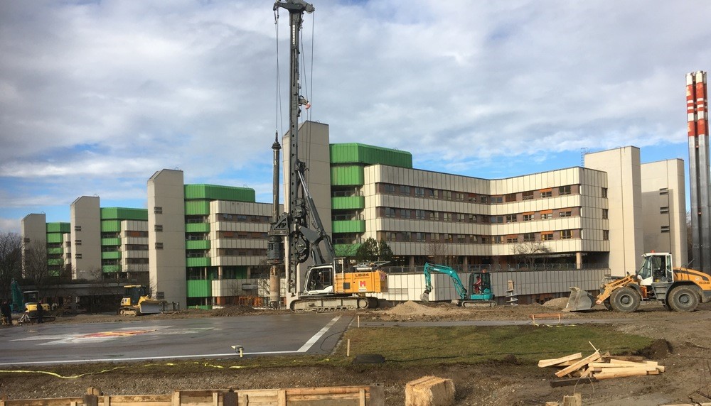 Die Bauarbeiten für die Erweiterung des Klinikums Bogenhausen laufen. Die asphaltierte Fläche im Vordergrund ist der alte Hubschrauberlandeplatz. Foto: hgb