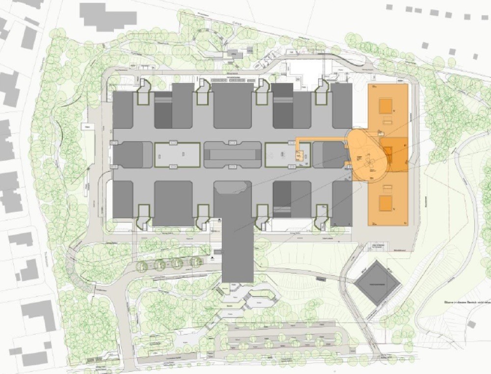 Der Erweiterungsbau (orange) des Klinikums Bogenhausen mit Hubschrauberlandeplatz auf dem Dach. Plan: München Klinik