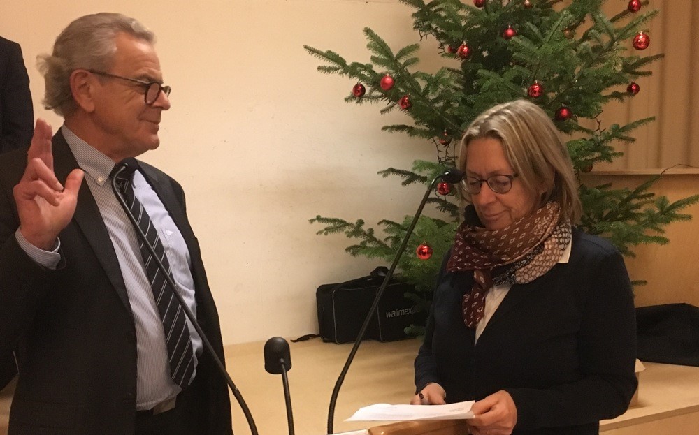 Bezirksausschuss-Vorsitzende Angelika Pilz-Strasser (Grüne) vereidigte Gerd Eckert als neues Mitglied des Bezirksausschusses Bogenhausen. Foto: hgb