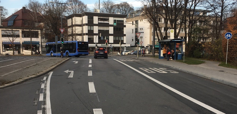 Die Verbesserung der Verkehrslage an der Einmündung der Denninger- in die Bülowstraße, genau­er die Fahrbahn neben der Linksabbiegespur für Rechtsabbieger zu markieren – das hatte der Bezirksaus­schuss auf Anregung eines Bürgers bei der Stadt beantragt. Wenige Wochen später liegt die Antwort vor: „Wir entsprechen Ihrem Wunsch.“ Geht doch!