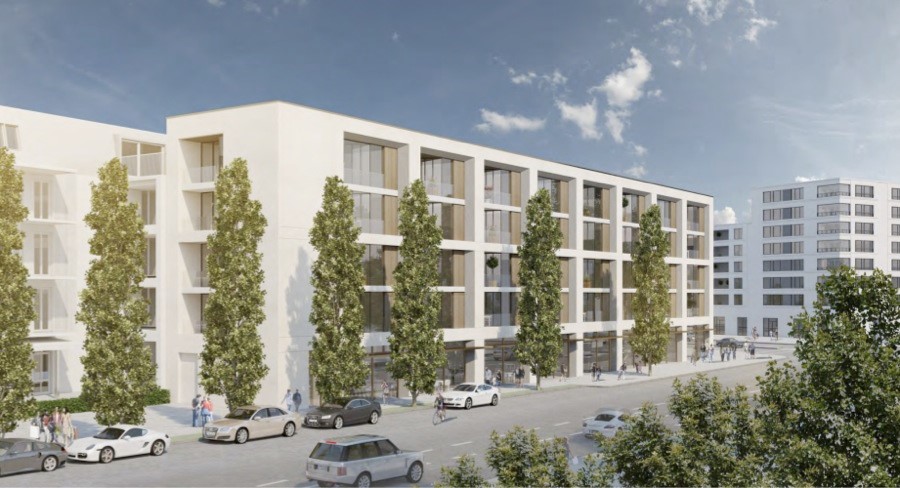 Visualisierung der Front entlang der Freischützstraße im ersten Entwurf für das geplante Eckgebäude. Visualisierung: 6B47 Germany GmbH