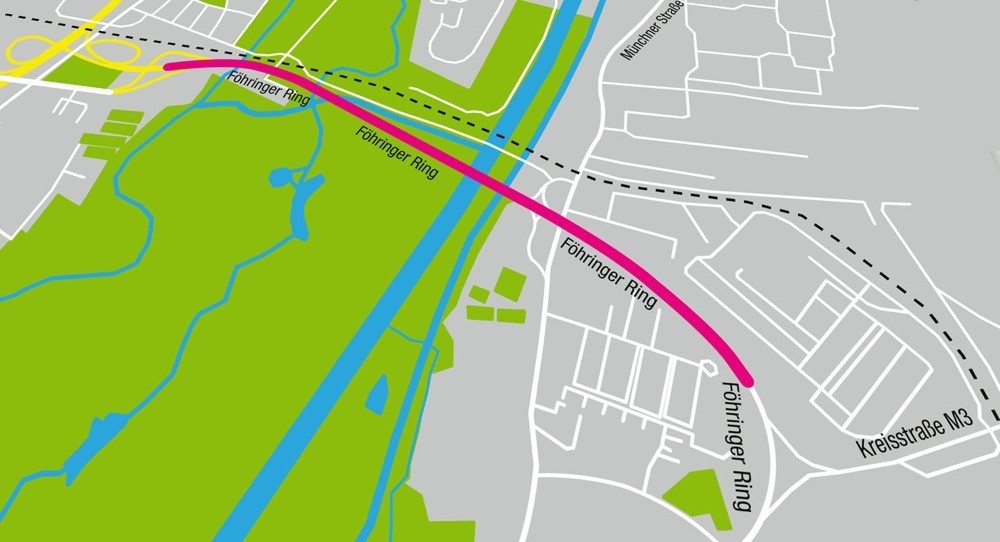 Auf 1,9 Kilometer Länge (rot) wird der Föhringer Ring bis 2025 vierspurig mit zwei Brücken über die Isar ausgebaut. Die Kosten: mehr als 50 Millionen Euro. Karte: Staatliches Bauamt Freising