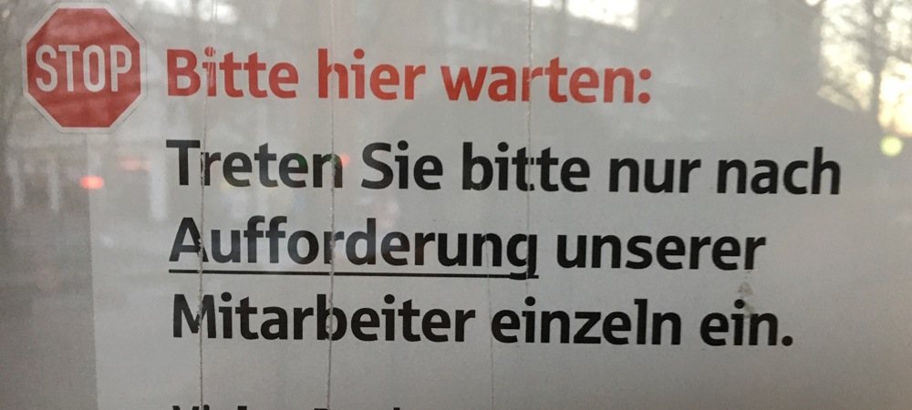 Und freiwillig Abstand halten war angesagt, jetzt m u s s der Zwischenraum mindestens 1,5 Meter, besser noch zwei Meter, zwischen z w e i Personen (und nicht mehr!) betragen. Um die Kontakte so gering wie möglich zu halten, bemühen sich Geschäftsleute und Unternehmen, bieten Lieferservice an und bitten Kunden, so lange vor dem Eingang zu warten, bis sie zum Eintreten aufgefordert werden.