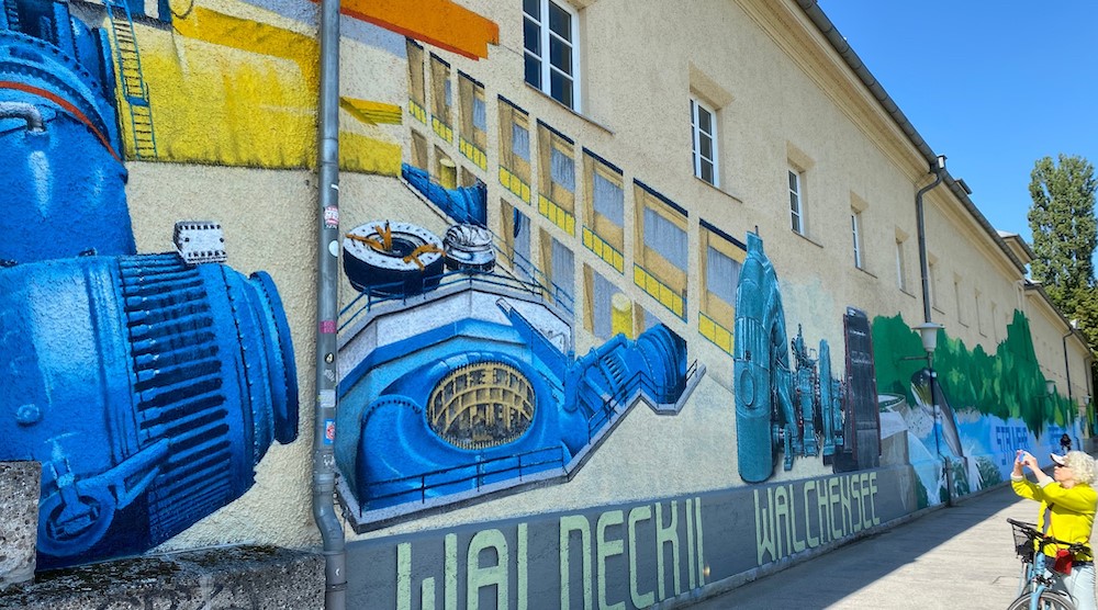 Immer wieder waren in der Vergangenheit am Oberföhringer Stauwehr an den Gebäuden illegal Sprayer aktiv, beschmierten und besudelten die Wände mit meist sinnlosen Darstellungen. Ein wahrhaft unansehnlicher Anblick. Doch jetzt ist das knapp 100 Meter lange Mauerwerk kunstvoll verziert. Der bekannte Münchner Graffiti-Akteur Loomit (Mathias Köhler) hat zusammen mit seinen Kollegen Lando und Bert im Auftrag des Energieunternehmens Uniper, Besitzer des Stauwehrs, ein Streetart-Werk der besonderen Art geschaffen. An der Front ist nun ein Ausschnitt des Wasserkraftwerks Waldeck / Walchensee, der Isar-Lauf mit einem großen Fisch, ein Schwan am Stauwehr und die gesamte Wehr-Anlage zu sehen – wohl derzeit eines der beliebtesten Fotomotive in München.