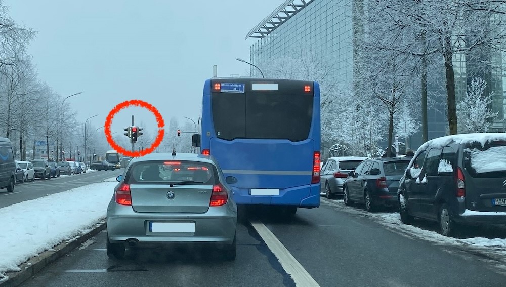 Beobachtungen von unser-bogenhausen.de verdeutlichen: Auch Radfahrer nutzen die Busspur (!). Busfahrer müssen zu den am Fahrbahnrand geparkten Autos großzügig Abstand halten, um nicht die (oftmals die noch „ausgefahrenen“) Rückspiegel zu „rasieren“. Wegen des Abstands fährt die Mehrzahl der Busse über die durchgezogene Linie der Geradeausspur. Die Folge: Der Bus kommt nicht durch, da vor der Ampel – wie viel auch immer – Autos stehen. Und ebenso hinter dem Bus. So passiert der Verkehr die Kreuzung an der Richard-Strauss-Straße nur „scheibchenweise“. Von Beschleunigung, zumal zu Zeiten mit verstärktem Aufkommen, für alle Beteiligten keine Spur!