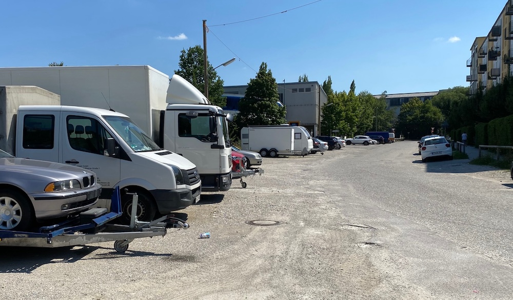 Am Rand der Schotterfläche Hochstiftsweg: Fahrzeuge aller Art mit Kennzeichen aus ganz Bayern, aus Polen, Österreich, Italien und der Ukraine, ja sogar ein Auto ohne Nummernschild auf einem Anhänger, parken dort – die Polizei kann nicht eingreifen, es ist kein öffentlicher Grund.    Foto: hgb