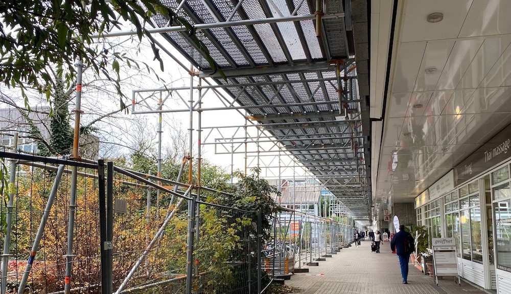 Nun sind die Wege entlang des Komplexes, der keinen Denkmalschutz hat, aus Sicherheitsgründen für Bewohner und Passanten, per Gerüst überdacht.