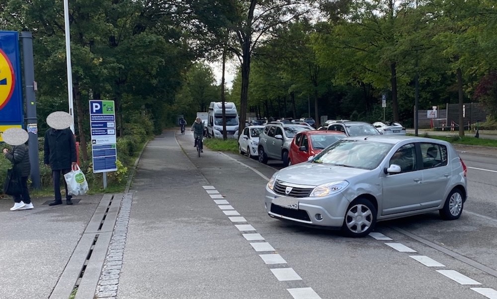 1. Radweg vor dem Lidl: „Vor der breiten Zufahrt gibt’s einen Radweg, der für einbiegende Autofahrer durch parkende Autos schlecht einsehbar ist. Ausfahrende Fahrzeuglenker übersehen vielfach die Radfahrer und die Autos auf der Straße. Mein Vorschlag: Den Radweg in Höhe der Zufahrt rot markieren. Vor der Zufahrt mindestens einen Parkplatz zwecks besserer Sicht entfernen.
