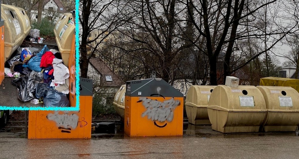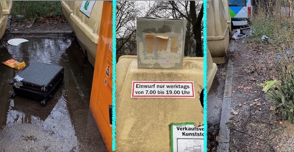 • Check von unser-bogenhausen.de vor Ort: Auf den ersten Blick ein ganz „normaler“ Standort. Beim Blick zwischen die acht Container und die zwei Kleiderboxen ein ganz anderes Bild: ein defekter Koffer, ein achtlos deponierter Weihnachtsbaum und verwelkte Blumen, mehrere gebrochene große Kunstdeckel, eine geknickte Fernseherverpackung, jede Menge Laub und Kleinmüll am Rand und an der Böschung. Und bei einem Stoß mit dem Fuß an eine der Kunststoffkisten huschten aufgeschreckt zwei Mäuse vorbei …