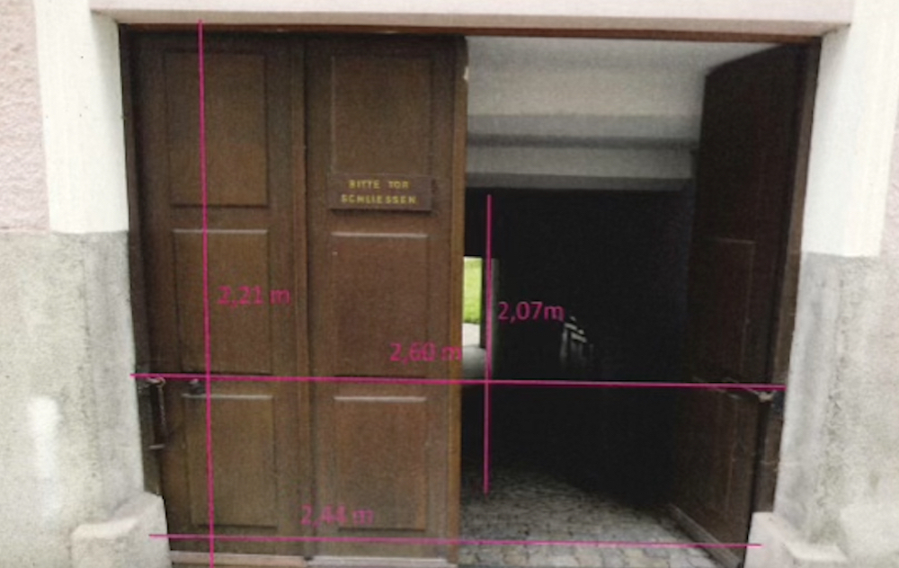 Einfahrt Mauerkircherstraße 17 – ein Anwohner argwöhnt: „Um Baufahrzeuge durchzuzwängen, müsste sie brutal aufgebrochen werden.“   Foto und Bearbeitung: Privat / Anlage zu BA-Antrag