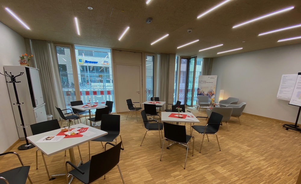 Das Zentrum bietet vielfältige kulturelle Angebote für alle Altersgruppen sowie soziale Beratungsdienste, wie zum Beispiel den Mittagstisch für Senioren oder den Familientreff für junge Mütter. Das Haus – Erdgeschoss plus zwei Etagen – überzeugt durch einen funktionalen Grundriss. Öffentliche Bereiche sowie Verwaltungs- und Funktionsräume befinden sich entlang einer zentralen Foyer-Achse, was die Übersichtlichkeit und die Orientierung erleichtert. Großflächige Verglasungen fördern Transparenz. Der rund 230 Quadratmeter große Saal mit Bühne im Obergeschoss ist flexibel nutzbar, bietet Platz für bis zu 300 Personen für Konzerte, Vorträge, Theater oder als Speisesaal des ASZ. Dort sollen in Zukunft – der Termin ist noch offen – auch die Mitglieder des Bezirksausschusses tagen.