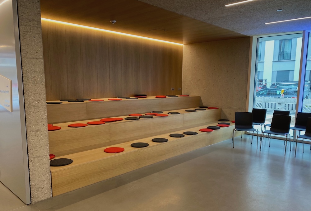 Ein durchgehendes Foyer wirkt quasi als offenes Scharnier und verbindet so den Maria-Nindl-Platz mit der benachbarten Ruth-Drexel-Schule. Es dient auch als Raum für informelle Begegnungen, Ausstellungen und kulturelle Aktivitäten. So trägt die Neue Ziegelei architektonisch und funktional auf vielfältige Weise zur sozialen Vernetzung im Viertel bei.