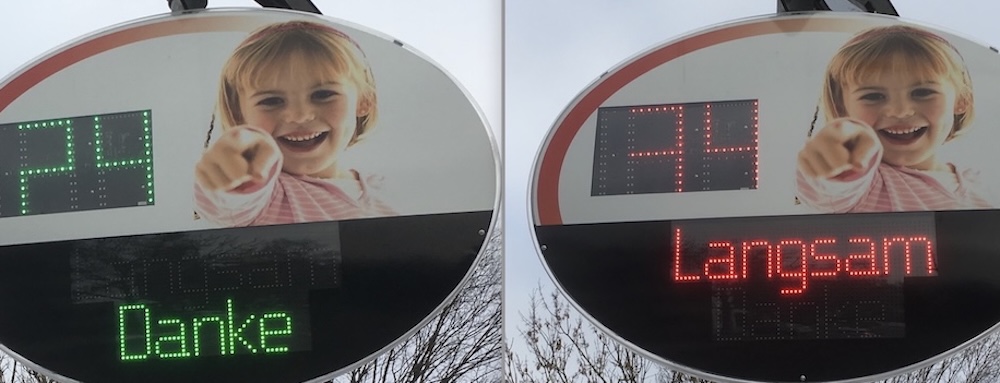 Wie funktionieren Dialog Displays? Passiert ein Autofahrer den Kontrollbereich in vorgeschriebenem Tempo oder langsamer, leuchtet das Wort „Danke“ in grüner Schrift auf, darüber erscheint ein lachendes Kindergesicht auf der Anzeigetafel. Tritt ein Fahrer hingegen das Gaspedal durch, ist er zu schnell unterwegs, mahnt das Display in Rot „Langsam!“. Die Displays treten quasi in Dialog mit den Autofahrern. Daher werden die Anlagen oft auch als „sprechende Verkehrszeichen“ bezeichnet.