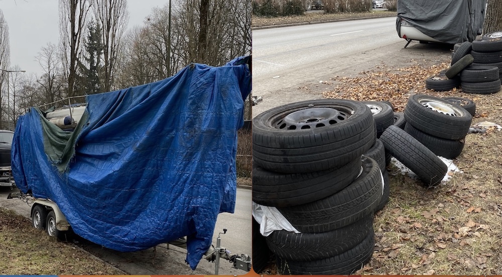 Gegen zugelassene, parkende Fahrzeuge kann die Polizei nichts bewirken. Aber: Der Halter eines Anhängers voller Altreifen wurde kontaktiert und aufgefordert, Anhänger und Altreifen zu entfernen. Sollte dies nicht geschehen wird er wegen eines Verstoßes nach den Kreislaufabfallgesetz angezeigt.