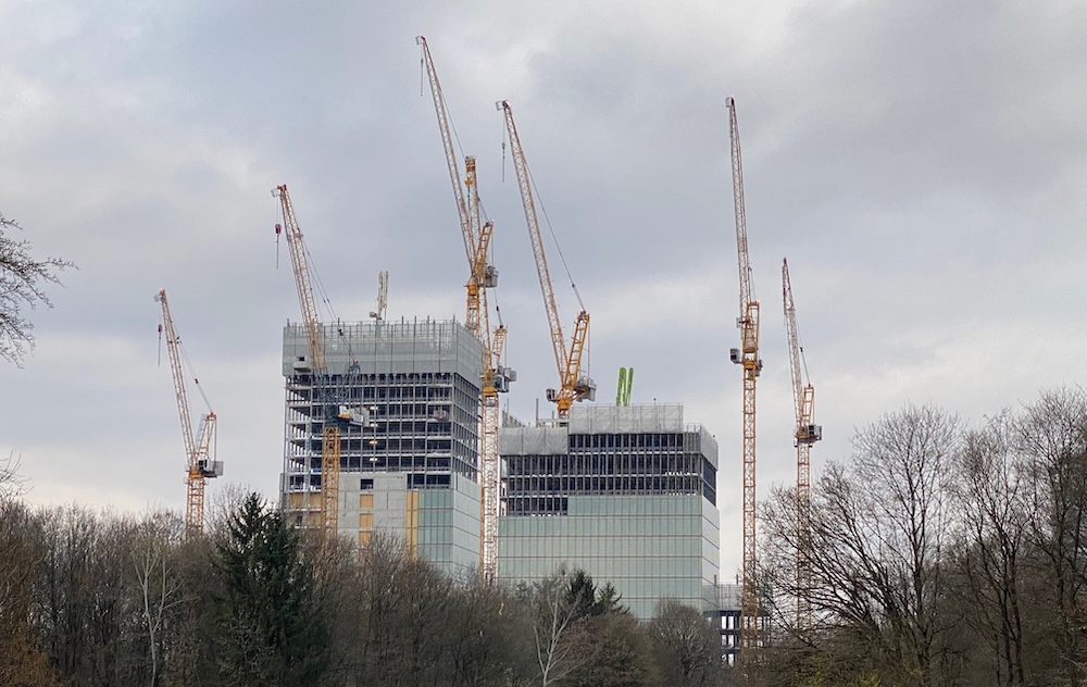 Hoch, höher, „Tridea“ = Ansicht mit sechs Kränen der Turmbauten der neuen Verwaltungszentrale der Bayerischen Versorgungskammer (BVK) an der Richard-Strauss-Straße aus Sicht am Denninger Anger. Foto: hgb